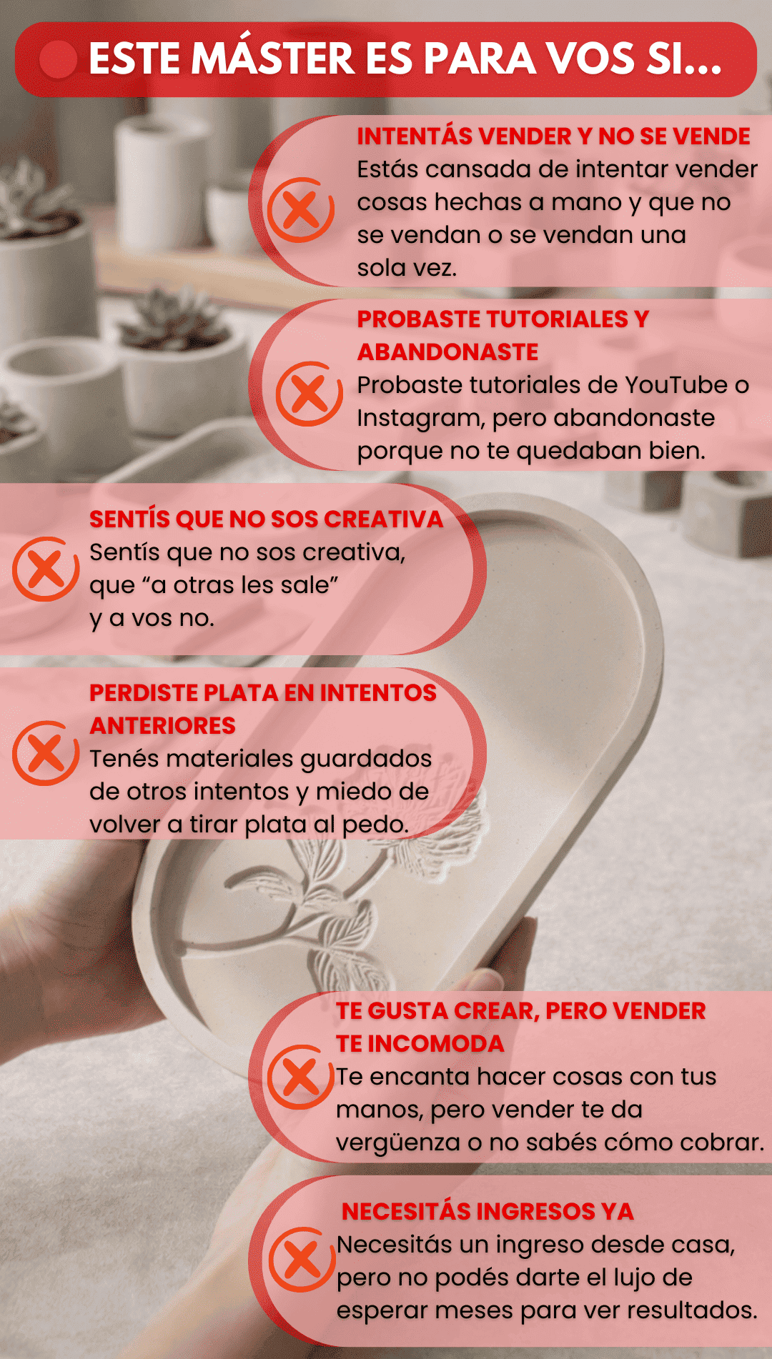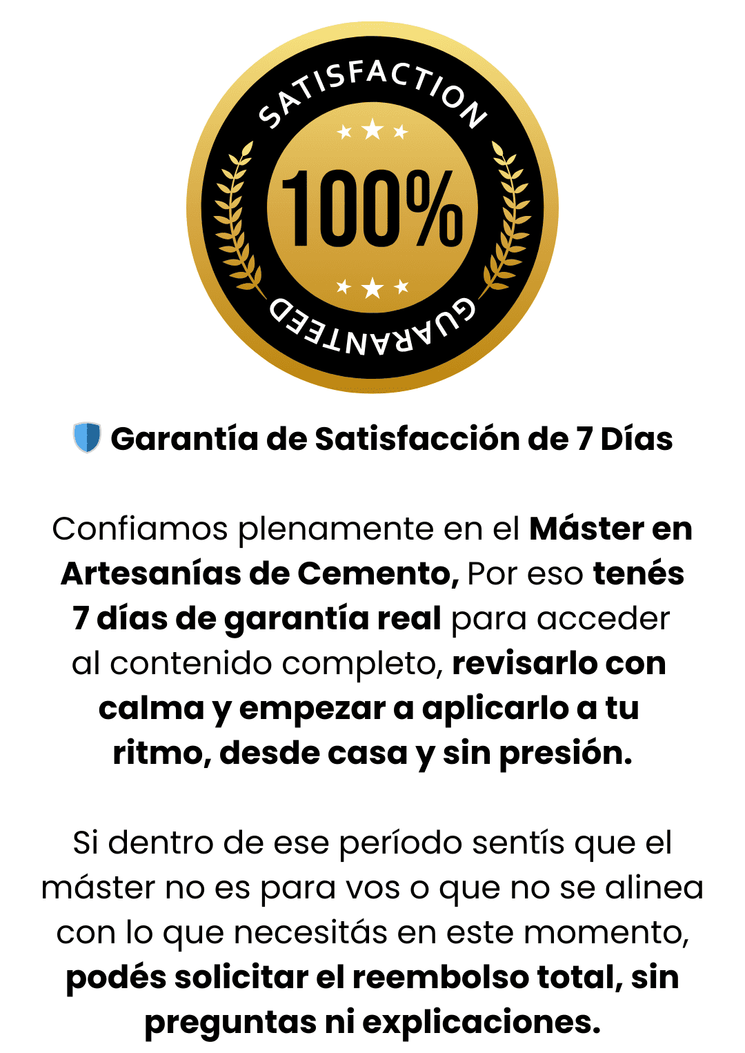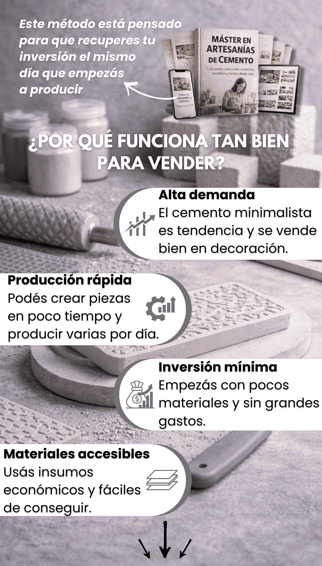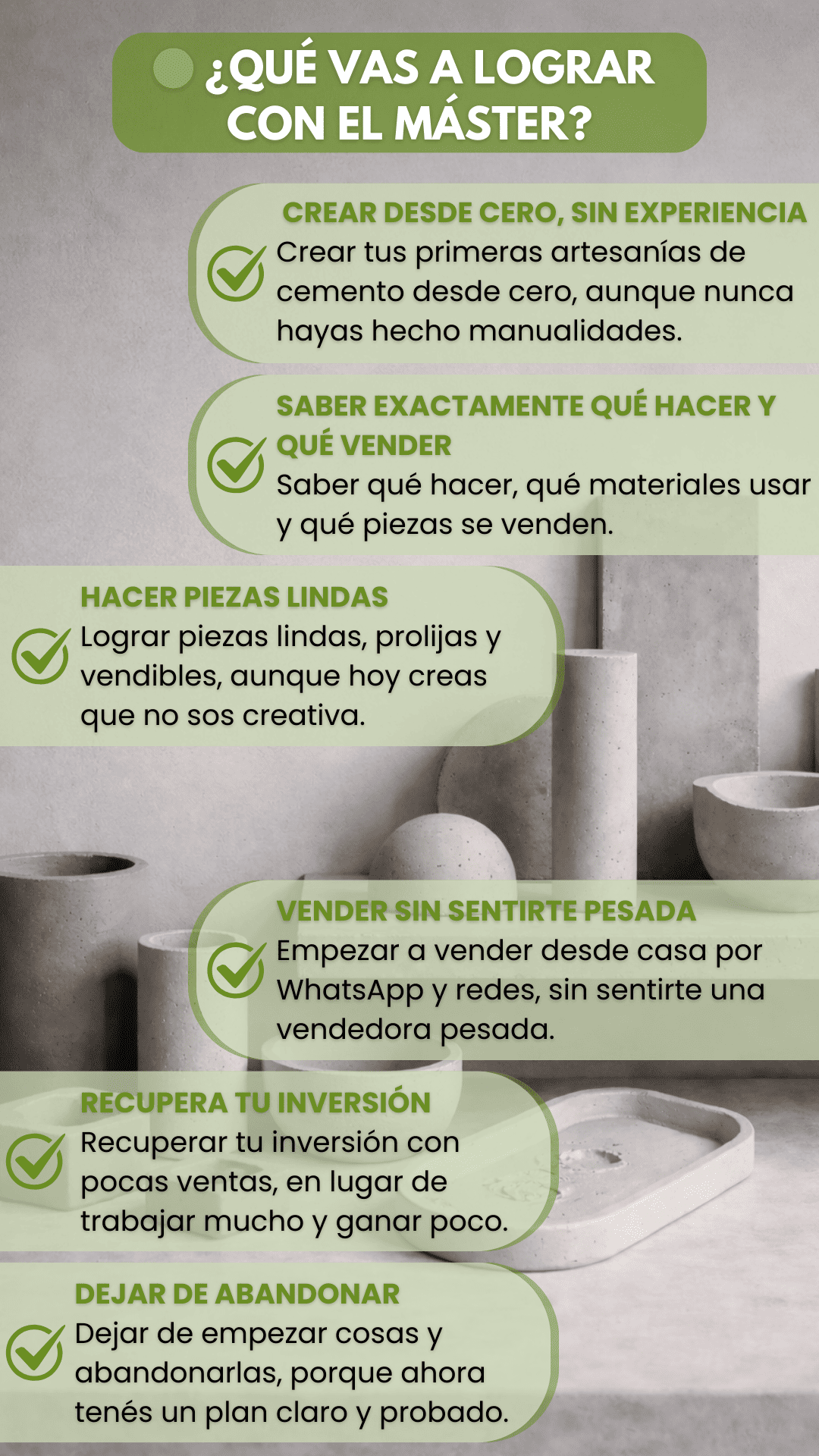 Siempre veía artesanías de cemento y pensaba que era complicado. Con este máster entendí todo paso a paso, empecé con pocos materiales y hoy tengo mis primeras ventas.