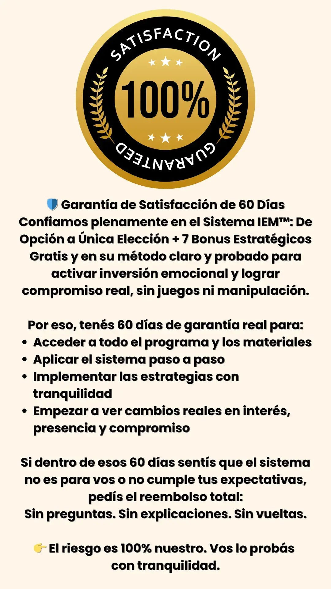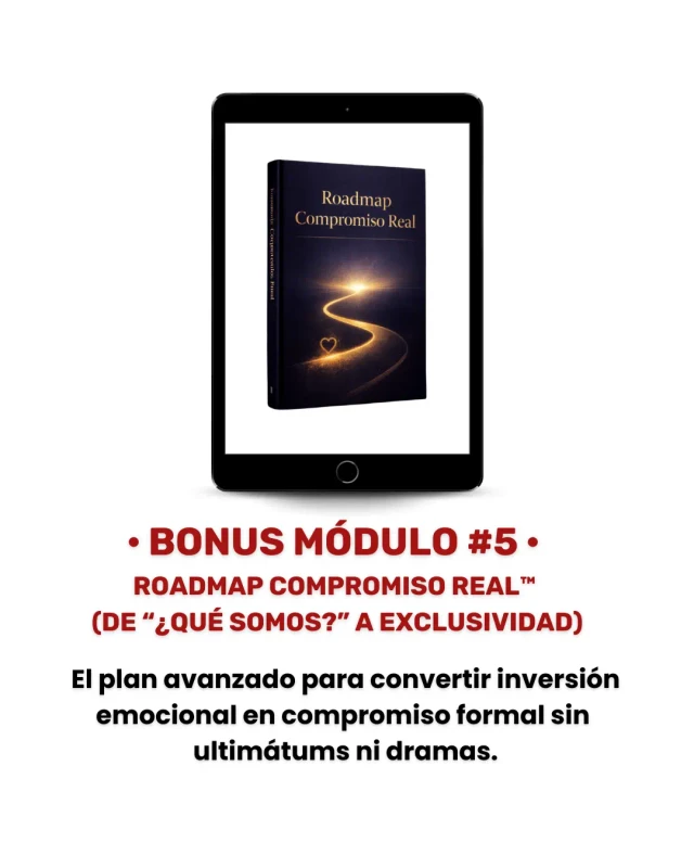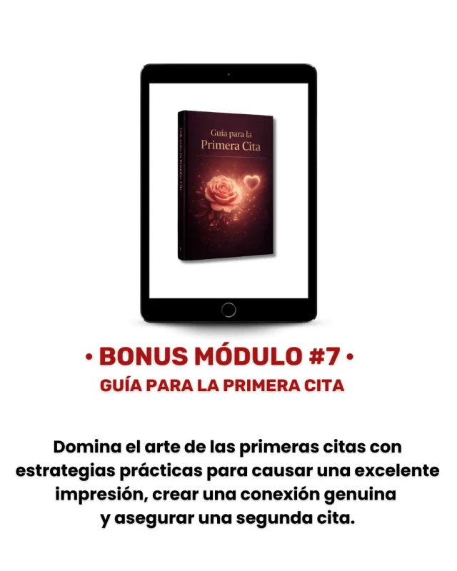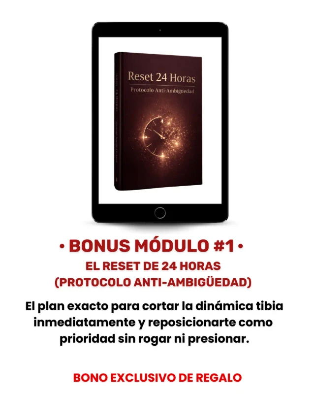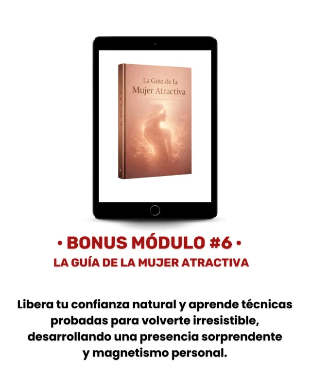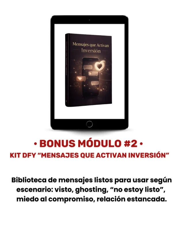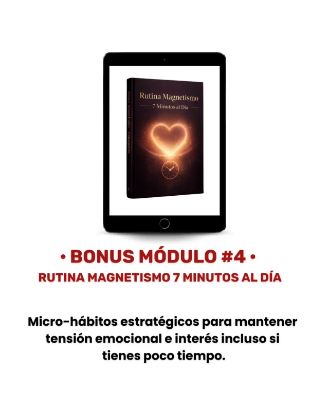 Incluye el programa principal paso a paso y 7 Bonus Estratégicos: protocolos, guías prácticas y materiales complementarios diseñados para acelerar resultados (mensajes DFY, anti-recaída, rutina de magnetismo, roadmap de compromiso y más).